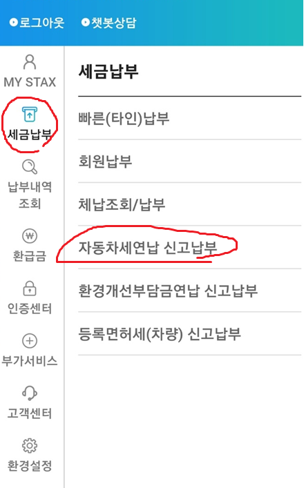 : STAX 앱  로그인 -->  오른쪽 메뉴 클릭 --> 왼쪽  메뉴 세금납부 --> 자동차세연납 신고납부