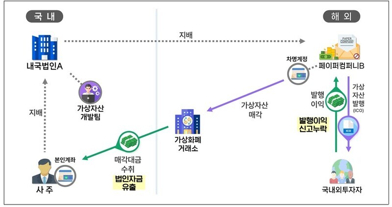 국내 비상장기업인 ‘ㄱ’사는 외국에 설립한 페이퍼컴퍼니를 통해 가상자산(암호화폐) 수백억원어치를 발행했다. ㄱ사 개발팀이 주도적으로 만든 이 가상자산 일부는 ㄱ사의 지배주주가 다른 사람 명의 계정으로 빼돌린 뒤 거래소에서 매각해 수백억원대 이익을 얻었다. ㄱ사가 가상자산 매각 이익을 국외 페이퍼컴퍼니와 지배주주에게 넘겨준 셈이다. 이로 인해 ㄱ사의 이익에 부과해야 할 세금도 외국으로 함께 새어나갔다.