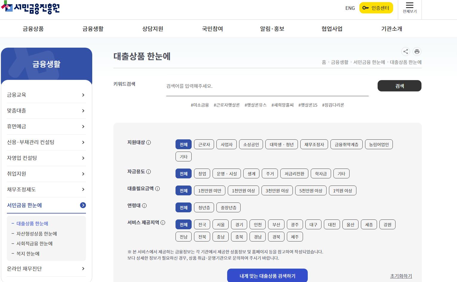 서민금융진흥원 홈페이지에 방문해서 ‘대출상품 한눈에’라는 서비스를 제공하고 있습니다.