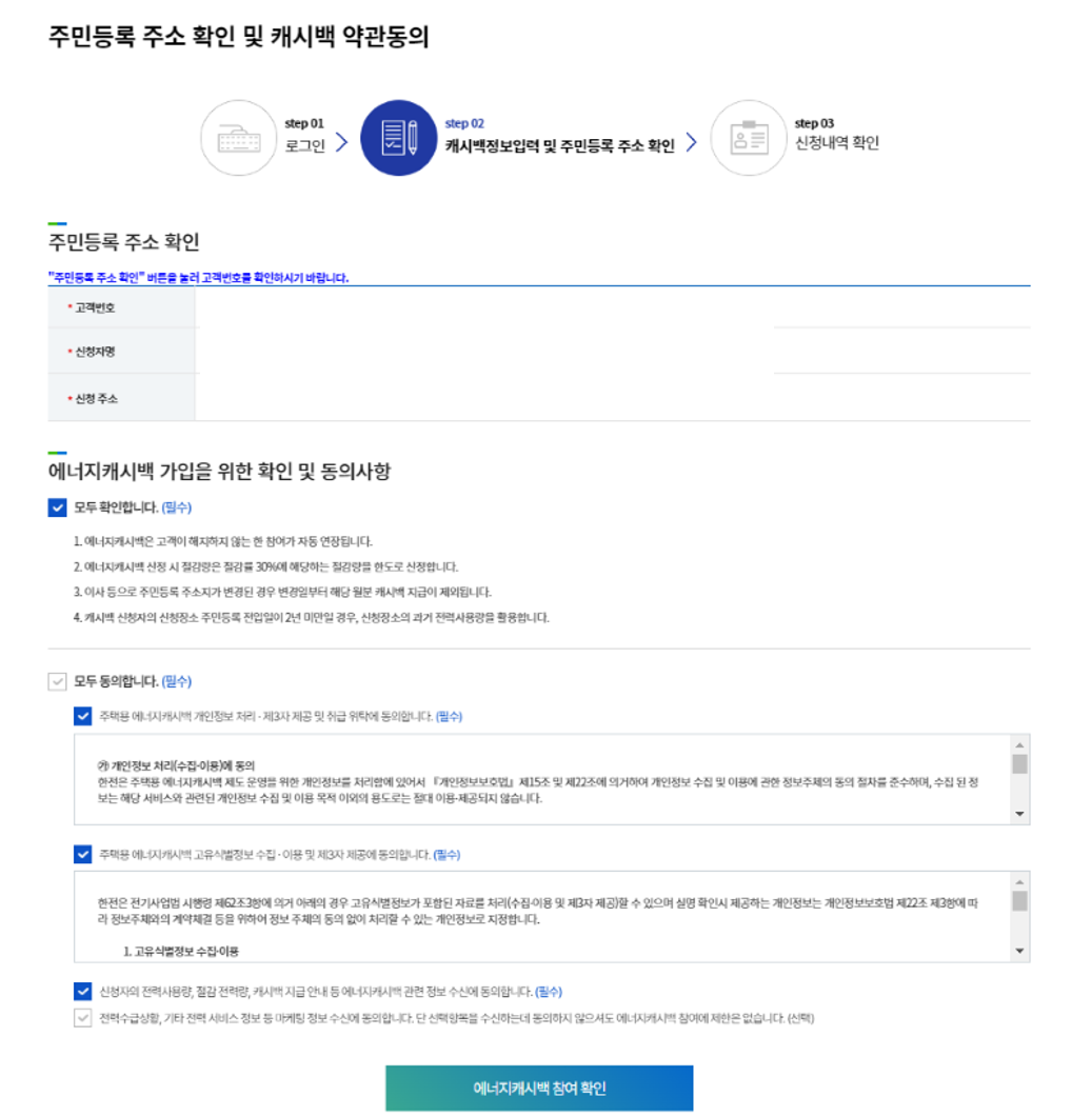 - 캐시백 정보와 주민등록 주소를 확인하고, 필수 동의사항에 체크