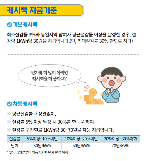 - 기본캐시백은 최소절감률 3%에 동일 지역 참여자 평균절감률 이상을 달성한 경우 절감량 1kWh 당 30원을 지급받을수 있습니다.