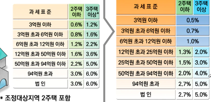 - 3주택 이상 합산 과표가 12억 초과 : 2%~5%(중과세율)