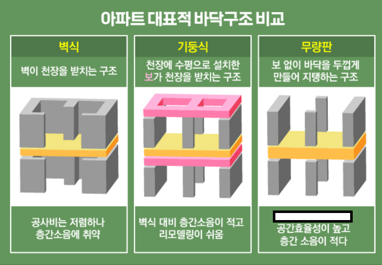 아파트 건축 방법에는 대략적으로 세 가지가 있습니다. 첫 번째로, '벽식 구조'는 80년대에 주로 사용되었습니다. 이 구조는 기둥 없이 벽이 천장을 받치는 형태로, 벽이 하중을 지탱하기 때문에 건설 후 구조를 바꾸기 어려운 단점이 있으며, 아파트 층간 바닥인 슬라브가 얇아 층간 소음에 취약합니다.